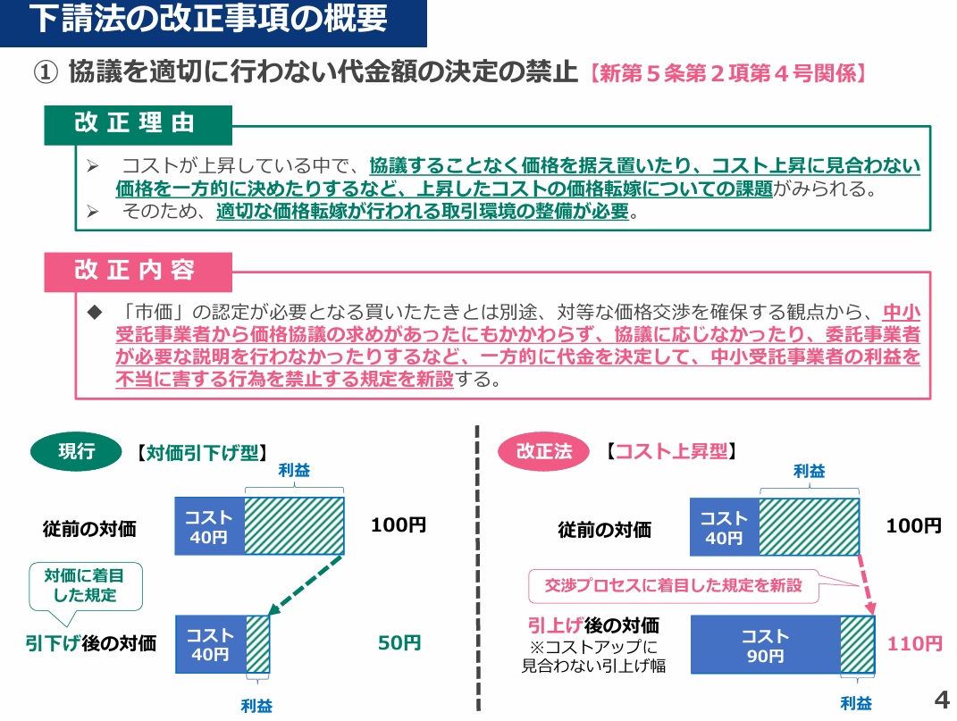改正内容は複数あるのですが、その多くが「発注者側に適切なコスト負担を求める」という趣旨であると解釈できます。